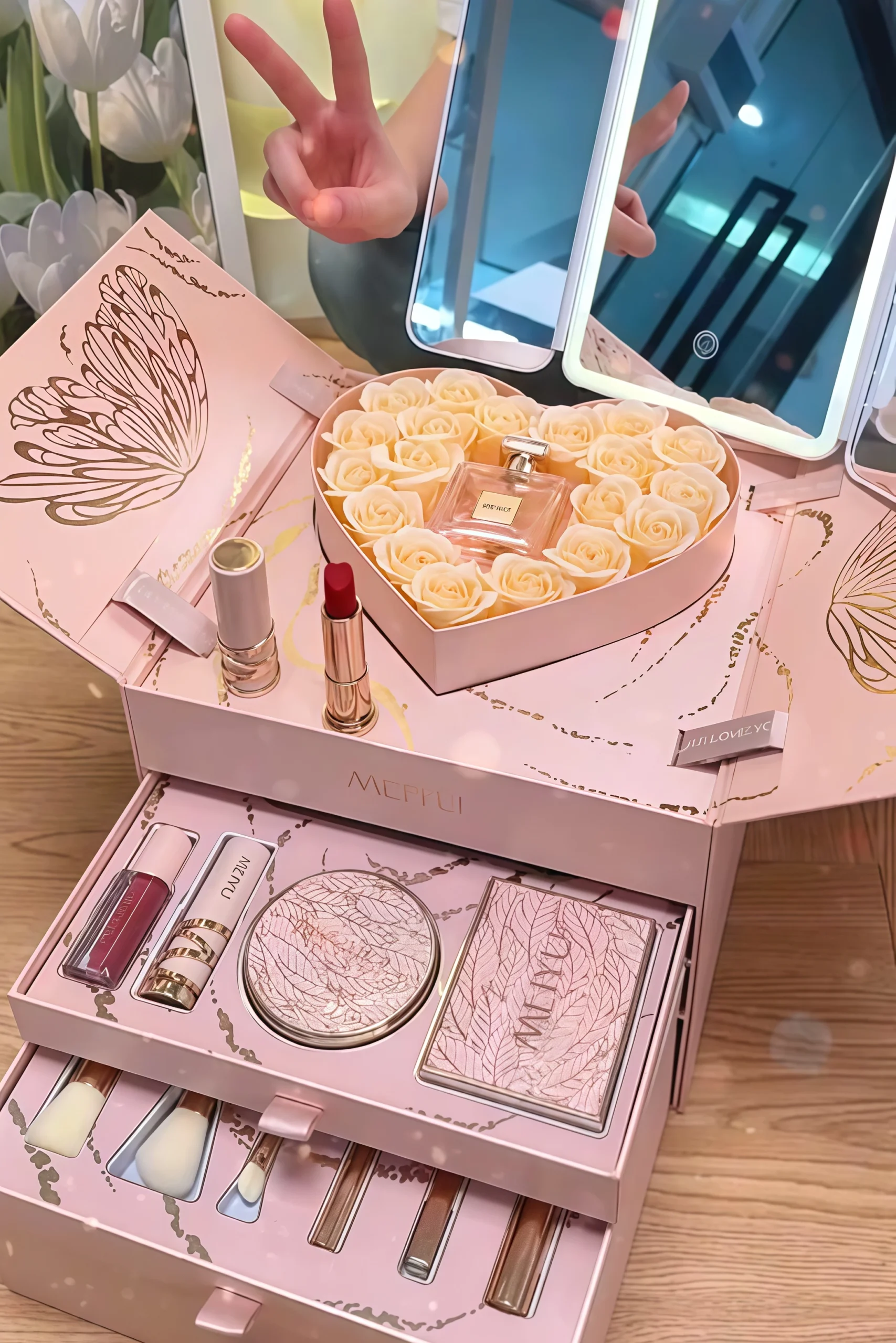 Luxury Heart Rose Makeup Gift Box with Mirror – Premium Beauty Cosmetic Set for Women